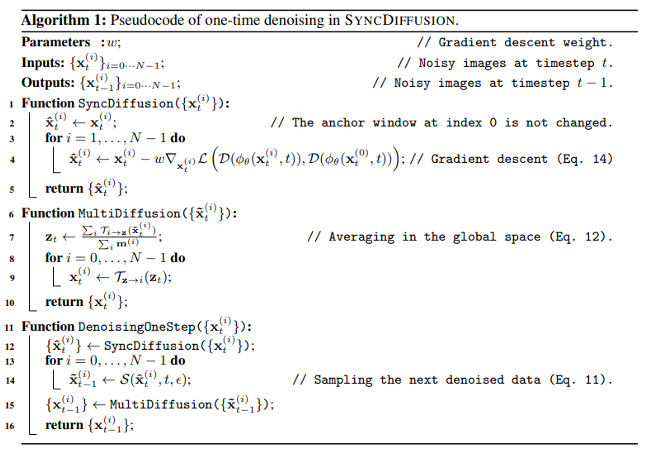 이 때, S(x_t, t, denoisor)가 diffusion time t 시점의 이미지 x와 diffusion time t 그리고, denoisor를 input으로 받아, t-1 시점의 이미지 x_{t-1}를 추정하는 함수라고 한다면, SyncDiffusion의 알고리즘은 아래와 같이 정리할 수 있습니다.
