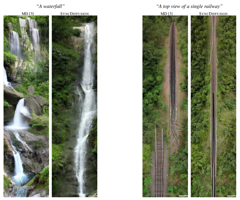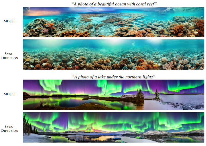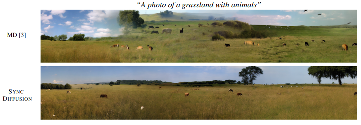 소개드릴 NeuIPS 2023의 SyncDiffusion: Coherent Montage via Synchronized Joint Diffusions는 이 문제를 적극적으로 다루고 있습니다. 구체적으로, 텍스트 prompt가 주어지고, 해당 prompt를 표현하는 파노라마 영상을 생성할 때, 여러 diffusion 모델들을 도입하여 사용하는 경우 생성된 이미지들의 perceptual coherency를 만족시키기에 어려움이 있었다는 동기에서 시작합니다.