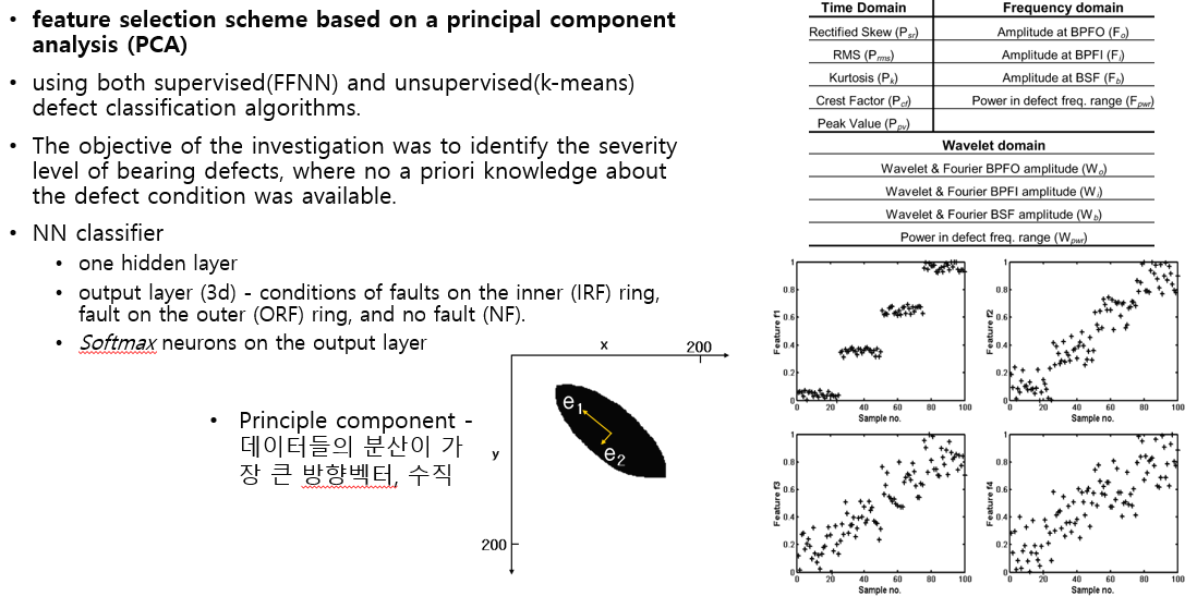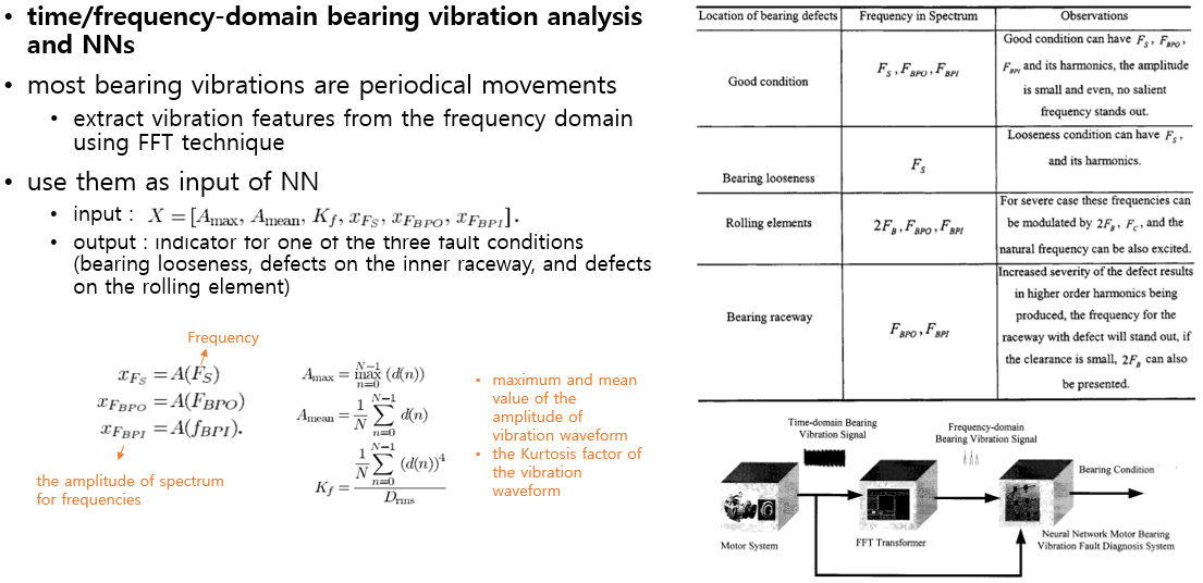 2000년에 발표된 Bearing vibration analysis에 Neural Network를 적용한 논문입니다. frequency domain에서 고속 푸리에 변환으로 feature를 추출하고 이를 1 layer Neural Net의 input으로 넣었습니다. input feature로는 6개를 사용했는데, 이는 뉴럴 넷을 통한 것이 아니라, 미리 정해져 있는 hand-crafted feature를 사용한 것입니다. Neural Net 모델의 output으로 세 가지 fault condition 중 하나를 결정하는 indicator를 출력합니다.