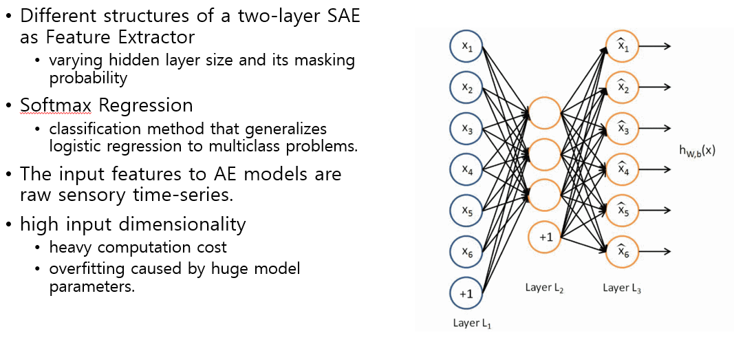 이 논문에서는 feature extractor로 2-layer Stacked Autoencoder를 사용하는데, 두 레이어의 hidden layer size와 dropout masking probability를 다르게 줍니다. 그 후 Softmax Regression을 사용하여 비정상 데이터를 탐지합니다. 앞의 논문들과 달리 feature를 추출하는 정해진 방법이 없고, 원형 센서 데이터를 그대로 모델의 인풋으로 넣어서 autoencoder가 특징을 배우도록 합니다.
