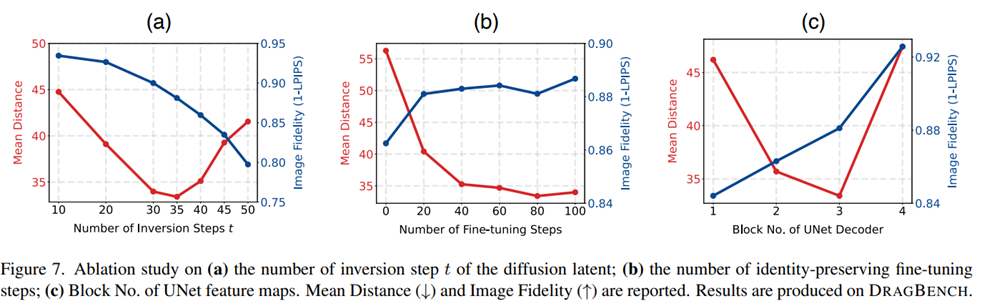 Ablation study에서는 앞서 언급한것과 같이 a) 어떤 time step에서의 latent optimization이 효과적인지 b) LoRA finetuining을 몇 에폭 진행하는것이 효과적인지, 마지막으로 c) UNet의 어떤 블록 feature map에서의 point-based image editing이 효과적인지 에 대한 실험을 진행합니다.