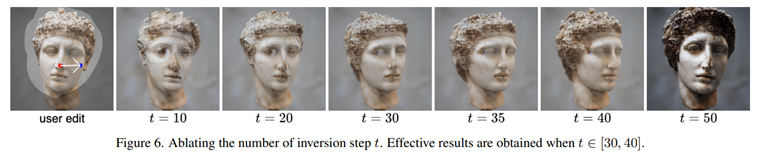 저자들은 (a) 그래프와 같이 Mean Distance가 제일 낮고, Image Fidelity score가 comparale 하게 높은 35 time step을 선정하였으며, 정성적인 결과는 아래와 같습니다. time step이 앞쪽에 있을 수록 (denoising이 많이 되었을수록), original data를 보존하려는 경향이 세므로, editing이 쉽지 않으며, time step이 50에 가까울 수록 (denoising이 안될수록) original data와는 상이한 이미지를 생성해내는 결과를 얻었습니다.
