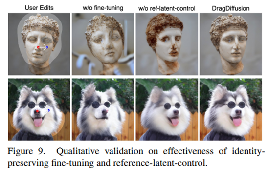 마지막으로, 저자들이 제안하는 componenet들의 영향력을 보여주기위해, 1) LoRA 기반의 Fine-tuning 과정이 없을 때, 2) Reference latent control을 수행하지 않았을 때, 그리고 3) DragDiffusion을 활용하였을 때의 성능을 평가합니다. original image와의 consistency를 개선하기 위해서는 fine-tuning stage와 reference latent control stage가 모두 수행되어야 함을 보였습니다.