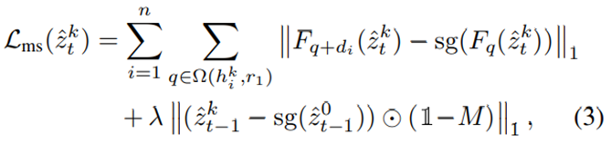 1) 첫번 째 term은 handle point $(h_i)$와 점차 target point $(g_i)$ 를 향해 이동하고 있는 점 $q+d_i (d_i=(g_i-h^k_i) / ||g_i-h^k_i||$ 에 해당하는 content를 handle point의 content로 유지시키는 역할을 수행합니다. 여기에 $sg(F_q(\hat{z}^k_t))$는 $k$ iteration 상에서의 handle point $q$에 해당하는 feature에 대해 "stop gradient" 연산을 취하여, 해당 handle point의 반경 r1 region의 content를 ground truth로 지정하겠다 라는 의미를 가집니다. 따라서 점차 target point를 향해 이동하고 있는 $q+d_i$에 해당하는 반경 r1 region에서의 content가 원래 handle point에서의 content와 같도록 유지하도록 규제하는 term임을 알 수 있습니다. 따라서 에폭이 진행될수록, $q+d_i$ 는 점진적으로 $g_i$로 움직이게 될텐데, 이렇게 point가 이동하는 동안 original content를 유지하도록 supervision해주게 됩니다.