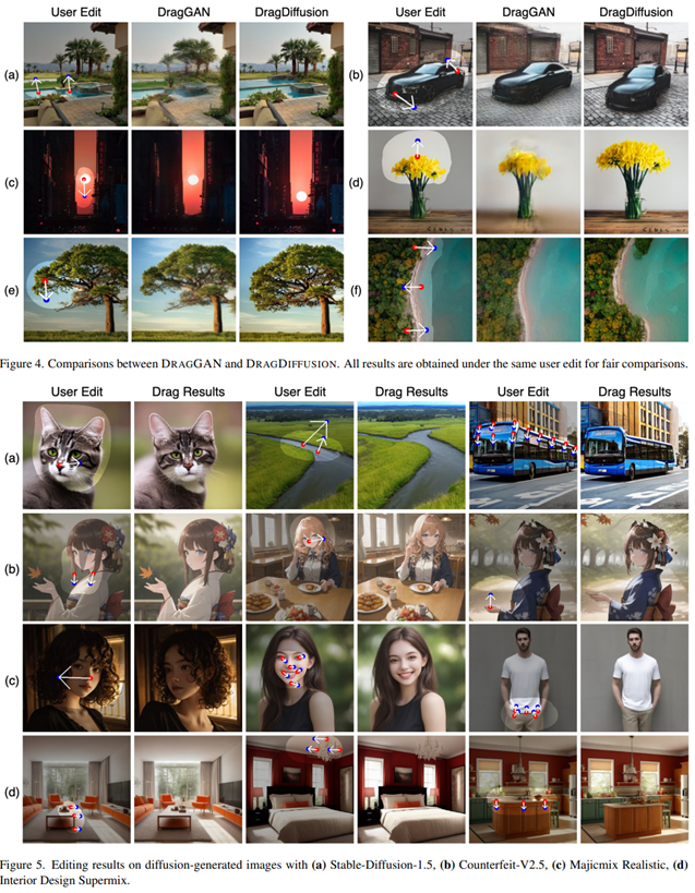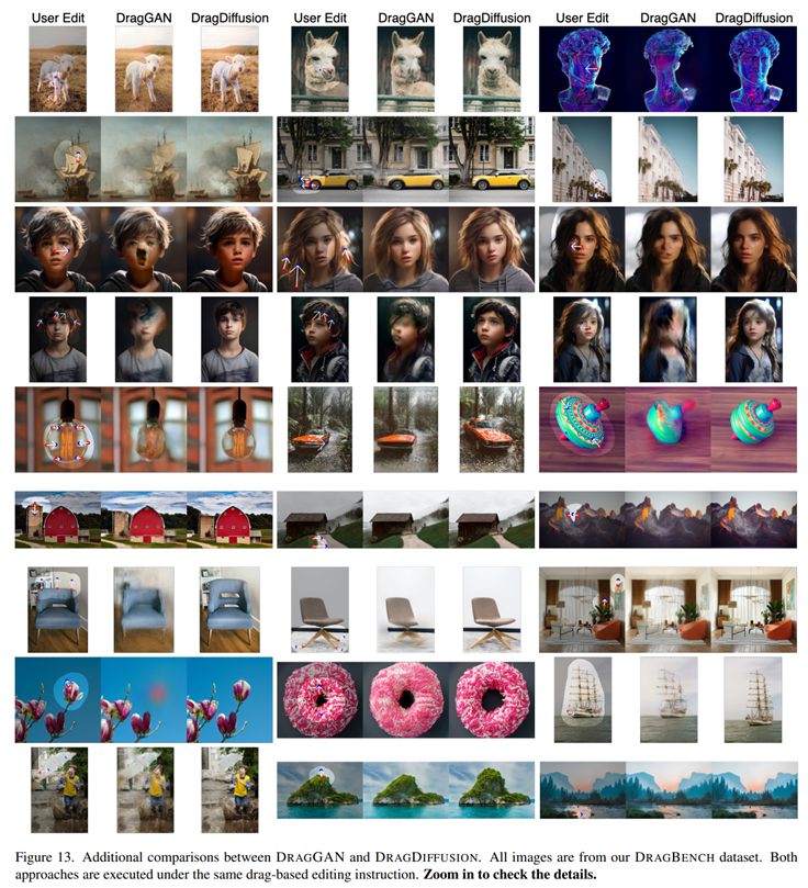 저자들은 다양한 예시를 통해 DragDiffusion의 우수성을 입증하고 있습니다. 아래의 실험결과들은 마스킹 영역에서의 point based image editing이 매우 효과적으로 동작하고 있음을 보입니다. 저자들은 baseline으로 DragGAN를 선택하여 수정된 이미지 성능을 비교하고 있으며, DragDiffusion은 DragGAN에서 나타나는 제한된 capacity 문제를 해결하며, original content를 유지하며 원하는 부분에 대한 point based image editing이 잘 수행됨을 증명하고 있습니다.