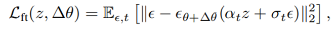 첫번째로, 이미지를 수정하기 전, original image의 content를 유지하면서 원하는 region에서의 수정을 가능하게 하기 위해, Diffusion model의 UNet (denoiser)을 fine-tuning 합니다. 해당 프로세스의 목표는 UNet이 입력 이미지의 특징을 더 정확하게 인코딩하여 편집 과정 전반에 걸쳐 이미지의 동일성을 일관되게 유지하는 것입니다. Cost-efficient한 fine-tuning을 위해서 DragDiffusion은 LoRA 기법을 활용하며, 목적함수로는 input image와 생성된 이미지의 noise reconstruction loss를 최소화하는 방향으로 fine-tuning 됩니다.
