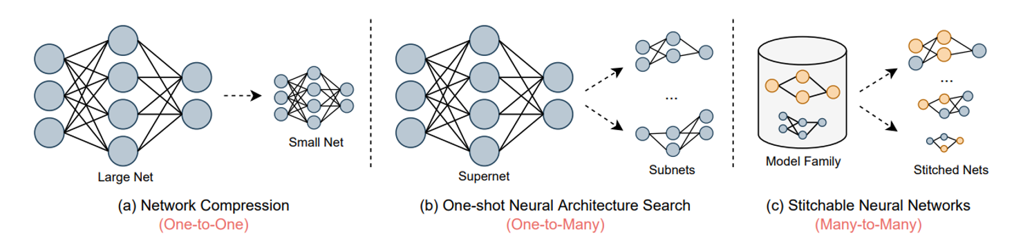 이번 공유 내용에서는 지난 업로드와 마찬가지로 생소한 주제를 준비해보았습니다. 제가 준비한 내용은 직접 범주화하기에 까다롭지만, Neural Architecture Search (NAS)처럼 보일 수 있는, model stitching에 관한 한 가지 연구, "Stitchable Neural Networks, CVPR 2023 (Spotlight)"를 소개드리고자 합니다. Model stitching은 최근 공개 저장소에 딥러닝 모델들의 급격한 배포가 이루어짐에 따라 (HuggingFace ~81k models, timm ~800 models), 수많은 사전 학습된 모델의 중간 중간 피쳐를 잘 연결하면, 기존 모델보다 더 비용적으로 효율적이고, 우수한 성능을 만들 수 있지 않을까?하는 아이디어에서 출발합니다. 아래의 그림을 통해 이해해봅시다. 우리가 잘 알고 있는 Network compression (pruning, quantization, knowledge distillation)의 기법은 단일 모델에 대해서 sub-optimal 구조를 찾고자 합니다 (one-to-one 관계). 경량화에서 NAS는 단일 모델에서 여러 가능한 sub-network를 찾는 문제로 볼 수 있습니다 (one-to-many). 이 방법들은 결국 하나의 large 모델에서 출발해야 한다는 scalability의 문제가 있습니다.