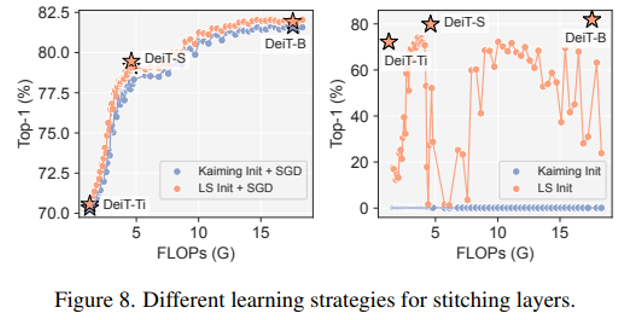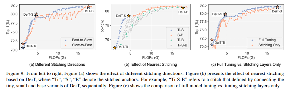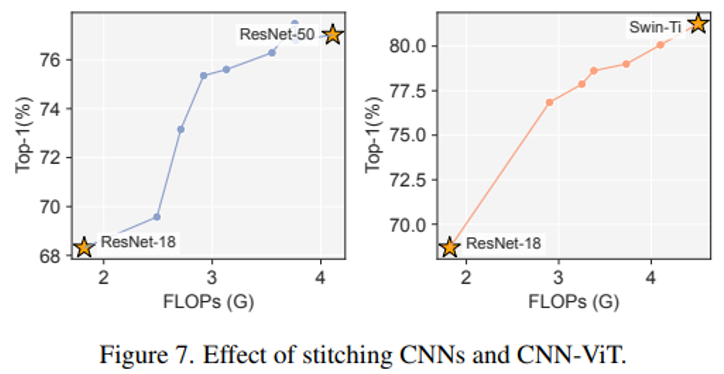 저자들은 위의 방법대로 stitching할 때, 서로 다른 구조의 딥러닝 모델, 예를 들면, ViTs와 CNNs,에 대해서도 적은 성능 저하를 통해 SN-Net 구현이 가능하다고 말하고 있습니다.