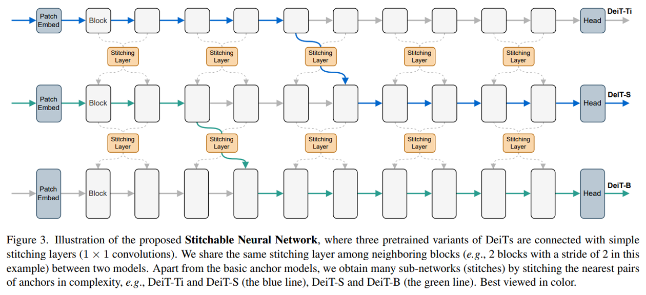Stitchable Neural Networks (SN-Net)는 사전 학습된 같은 계열의 모델을 연결합니다. 이는, 같은 task를 통해 사전학습된 같은 계열의 딥러닝 모델의 구조 (예, DeiT-Ti/S/B)는 서로 stitching될 수 있다는 과거 연구 결과를 바탕으로 합니다. 이를 위해, SN-Net은 같은 계열의 모델 집합에서 잘 동작하는 모델 한 가지를 anchor로 도입하여, 다른 모델의 특정 레이어로 activation을 전파하기 위해 간단한 stitching layer를 도입합니다. 이 방법을 통해, SN-Net은 자연스럽게 anchor에서 다른 모델로 accuracy-efficiency의 다이나믹한 trade-off를 활용하며 interpolation할 수 있고, 이러한 특성을 바탕으로 하나의 neural network 설계를 배포할 하드웨어의 조건에 맞도록 컨디셔닝할 수 있습니다.