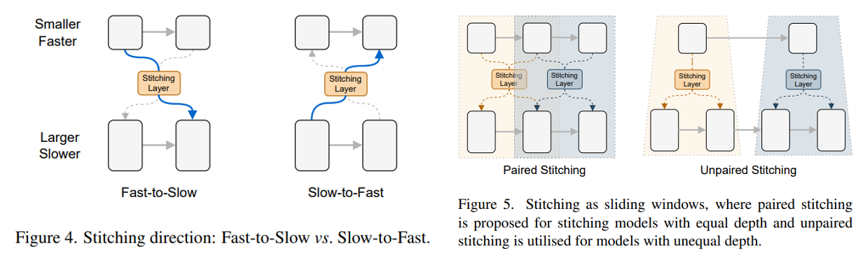 본 논문에서 도입하는 stitching 전략은 크게 두 가지 관점에서 출발하는 데, 하나는 Fast-to-Slow, 다른 하나는 Slow-to-Fast 관점이며, Fast-to-Slow의 경우 작은 모델의 특정 레이어에서 큰 모델의 다음 레이어로 연결하는 방법 그리고 Slow-to-Fast는 이와 반대입니다. Fast-to-Slow가 경험적으로 더 좋은 성능을 보였으며, Anchor와 모델의 구조가 다른 경우, 실험적으로 같은 경우보다 최적점을 찾기 어려운 현상을 언급합니. Stitching 방법은 2가지를 고민할 수 있는데, paired stitching과 unpaired stitching으로 살펴볼 수 있습니다. 설명은 아래의 그림과 같습니다.
