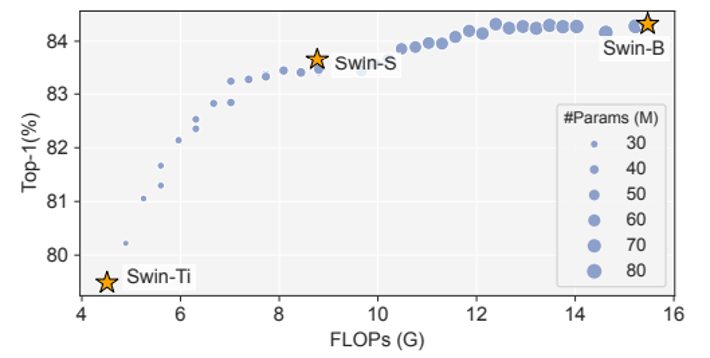 먼저, Swin-Ti/S/B를 사용하여 ImageNet-22K에 대한 SN-Net의 성능은 아래와 같습니다. 본 논문은 Top-1의 gap이 Swin-S와 Swin-B 사이에서 83.1%, 83.5%로 minor한 반면, FLOPs 차이는 8.7G와 15.4G로 상당한 데 반해 두 모델을 조합하는 최적화된 SN-Net이 성능과 FLOPs 측면에서 효율성을 가질 수 있음을 보입니다.