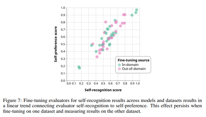 Figure 7. Fine-tuning을 일부 한 데이터셋에 적용하더라도, 다른 데이터셋에 대해서도 이러한 self-recognition과 self-preference의 능력이 동일하게 비례하다라는 결과를 보여주는 실험입니다.