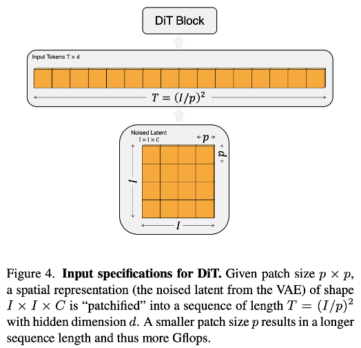 이를 바탕으로, 아래의 그림과 같이 DiT는 ViT와 유사한 동작을 지닌 diffusion backbone으로 사용하기 위한 Transformer 구조를 제안합니다.