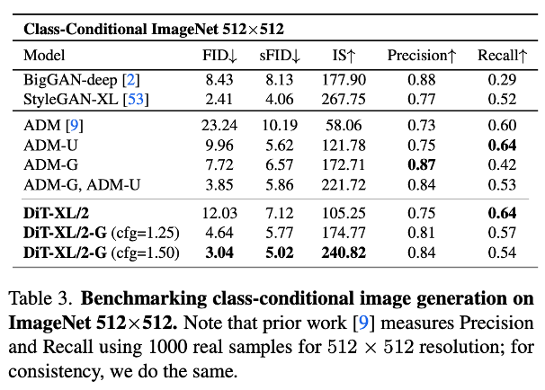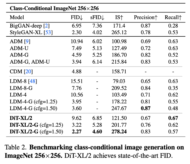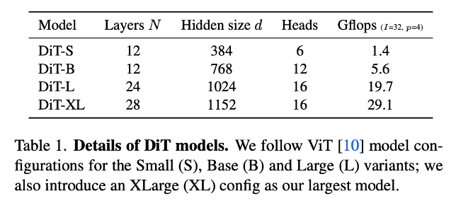 DiT는 따라서, layer 개수, token들에 대한 embedding 크기, multi-head attention의 head 개수, 그리고 패치 크기에 따른 scalability를 가질 수 있으며, 해당 성능이 CFG를 사용할 때 U-Net 기반의 LDM 보다 뛰어난 것을 확인할 수 있었습니다.