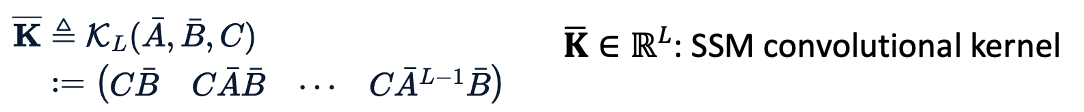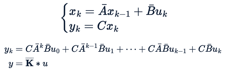 따라서, HiPPO는 input sequence를 받아 output sequence를 도출하는 seq2seq 형태의 레이러를 deterministic하게 구성할 수 있게 되었으며, 이산화를 통한 RNN은 병렬 연산에 적합하지 않은 것을 고려하여 기존 연속적인 상태에서 아래와 같이 convolution으로 전개하여, 이를 이산화하는 방법을 고민하였습니다.