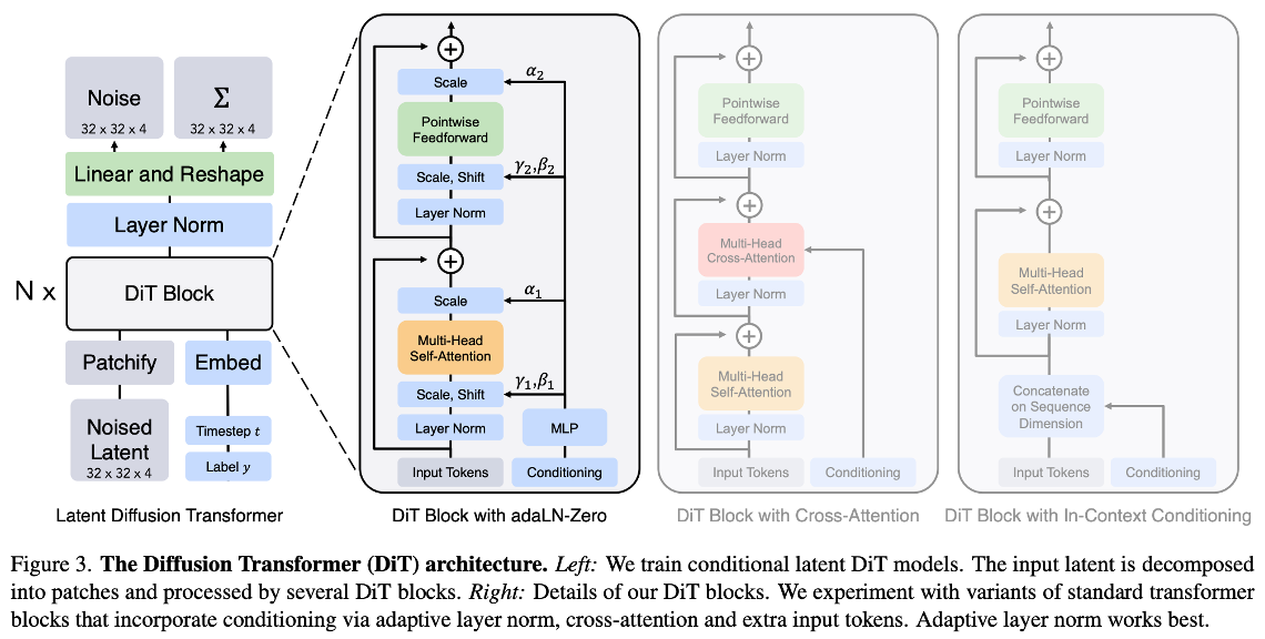 최근 DM은 DDPM (Ho et al., NeurIPS 2020)의 학습 기술에서 나아가 covariance에 대한 추가적인 최적화 (Nichol and Dhariwal, ICML 2021) 및 classifier-free guidance (CFG) (Ho and Salimans, NeurIPS 2021 Workshop, 2021) 기술을 바탕으로 강력한 generative power를 얻게 되었습니다. 한편, pixel space에서 latent space로 diffusion process를 확장함 (Rombach et al., CVPR 2022)에 따라, 효율적인 병렬 연산에 따른 연산 복잡도를 최적화할 수 있었습니다. (이 배경에 대한 자세한 내용은 prerequisite으로 본 포스팅에서 다루지 않겠습니다.) 이러한 발전 과정 속에서 DiT는 Transformer가 가질 수 있는 conditioning의 이점과 Latent 정보에 대한 attention을 바탕으로 latent space 상에서 diffusion이 취해야 할 estimated noise 및 covariance를 예측하는 구조를 고민합니다.
