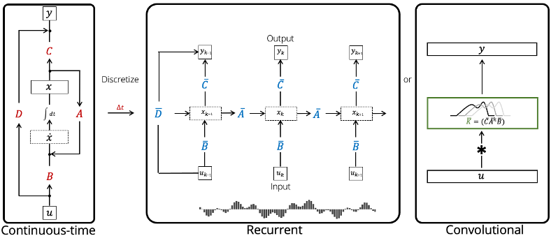 HiPPO-LegS 컨셉을 바탕으로, 이산적 SSMs에 대한 convolution 방법으로 확장할 수 있었으며, 아래와 같이 딥러닝 모델에서 seq2seq 처리를 위한 비용 효율적인 레이러를 구성하도록 제안하였습니다.