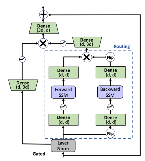 Gated bidirectional SSM은 "Wang et al., 2023"을 참고하여 S4D를 이용하여 제안되었고, 해당 모델은 아래의 그림을 바탕으로 DiffuSSMs에서 AdaLN-Zero와 Hourglass를 추가한 것으로 비교 확인할 수 있습니다.