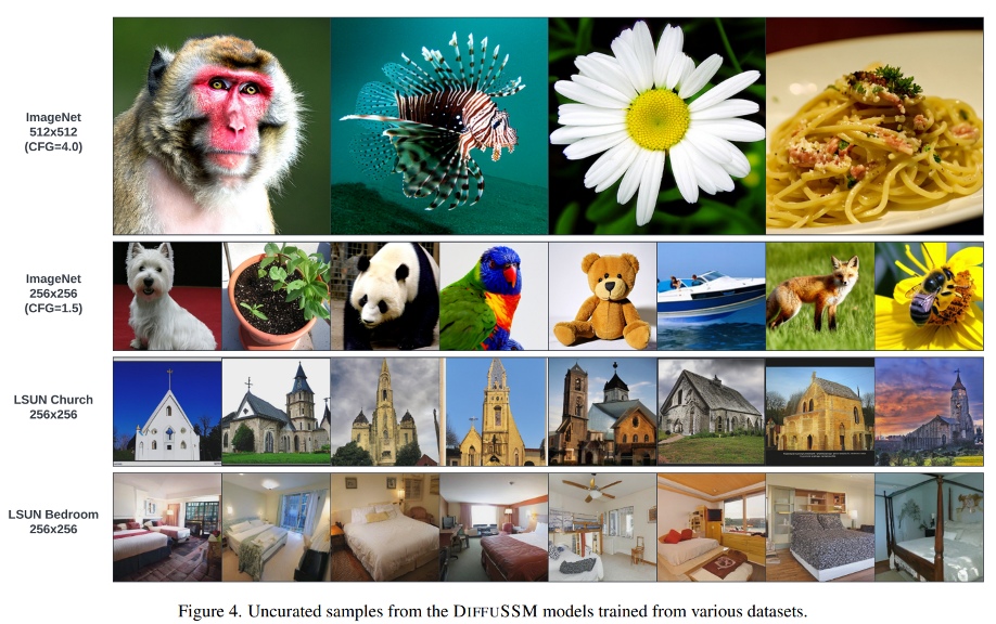 본 연구는 ImageNet (256x256, 512x512) 및 LSUN (256x256)을 활용한 생성 이미지 검증을 실시하였고, Stable Diffusion의 VAE를 활용하였으며, 8 NVIDIA A100에서 256 batch size를 활용했습니다. DiT와 동일하게 weight EMA update를 처리하였고, 비교 모델에 사용한 DiffuSSM-XL은 673M 파라미터를 보유하고 있습니다. (29 gated bidirectional SSM blocks weight matrix의 D=1152) Mixed precision을 사용하였고, ADM (Dhariwal and Nichol, NeurIPS 2021)의 diffusion 학습 전략을 이용했습니다.