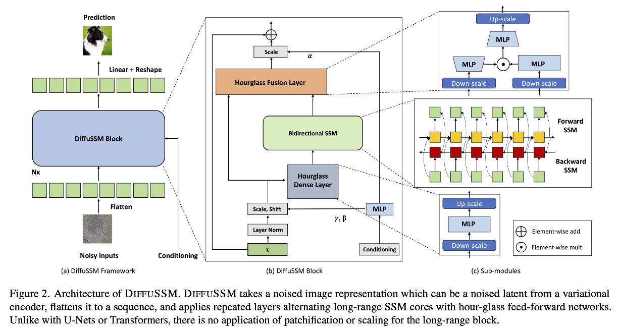 이에 따라, 본 논문은 아래의 그림처럼 DiffuSSM이라는 patchfication을 제거하고 DiT의 multi-head attention을 SSM으로 대체하는 방법을 제안합니다. AdaLN-Zero를 그대로 도입하였으며, SSM을 gated bidirectional SSM으로 설계하였고, input & output sequence에 대한 hourglass layer를 도입한 것이 특징입니다.