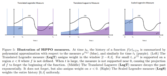 위의 개념을 바탕으로 딥러닝에서 활용되고 있는 SSM은 NLP에서 문제가 제기된 RNN에 관한 sequence처리 시 long-term sequence 정보를 보존하기 어려웠던 문제를 해결하자는 데에서 출발합니다. 대표적으로 HiPPO (high-order polynomial projection) (Gu et al., NeurIPS 2020)는 sequence 정보에 대한 memory 문제를 해결하기 위해 제안된 SSM 방법론인데요. 이들이 풀고자 했던 방법은 polynomial function sets가 주어질 때, 각 polynomial function에 적절한 가중치 c를 도입하여 기존의 input sequence f의 연속 시간 t까지의 신호를 기억하고자 할 때 c와 주어진 polynomial projection을 기반으로 이를 잘 reconstruction하는 c를 찾는 문제로 생각하여 접근하였습니다.